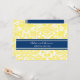 Custom rehearsal dinner party invitations in modern and elegant dark navy blue, bright lemon yellow and white chic and classic floral damask vintage pattern. Personalise the text to create a unique invitation for your wedding rehearsal dinner. Contact us to request a colour change. Available in many matching wedding products.