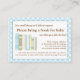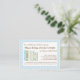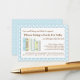 A charming poem requests that guests bring a book for the baby-to-be to start the new mum off with a library of beloved children's books. Just insert this sweet card inside the baby shower envelope. The adorable baby blue, yellow and mint colour scheme with a cute little row of matching books makes a perfect design to coordinate with just about any baby shower invitation for a boy.