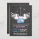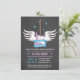This stylish, trendy and cool baby shower invitation has a lilac electric guitar with a pair of white wings behind it. The banner wrapped around the guitar reads "Rock a Bye Baby Shower" which is an amusing pun twist to a classic baby lullaby. Dark grey background has a light texture design to it. On the reverse is a classic vinyl record with musical notes and stars for decorations. This invitation is perfect for any rock and roll, music or rock star theme baby shower celebration! Personalise easily with your baby shower details.