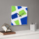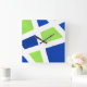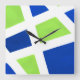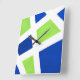 Wall clock printed with original geometric series acrylic painting in blue, lime green and white.