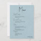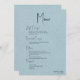 Whimsical minimalistic modern, customisable black script typography, elegant wedding menu. The light blue colour linen printed texture background adds a touch of organic feel of classic elegance. Other colours are available.