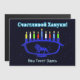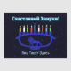 A blue, lion-themed Chanukkah menorah with lit candles superimposed on a starry background. Cyrillic (Russian) text reading, "Счастливой Хануки!" (Schastlivoi Hanuki - Happy Chanukkah) appears in glowing blue and white. Add your own additional text in Cyrillic, or change to an English-language font.