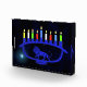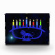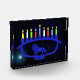 Features a blue, lion-themed Chanukkah menorah with all eight candles and the shamash burning. Chanukkah is the mid-winter "Festival of Lights."