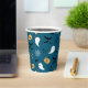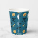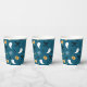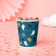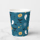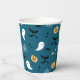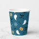 Cute paper cups featuring whimsical Halloween ghosts, pumpkins, spiderwebs and bats against a dark blue backdrop.