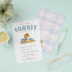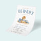 A charming western baby shower invitation featuring an adorable watercolor baby pony with blue cowboy boots and hat accents. Soft dusty blue tones and a delicate plaid background create a sweet country western theme, perfect for a baby boy shower, rodeo baby shower, or rustic cowboy celebration.