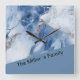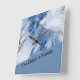 A square wall clock in dark blue, white and light blue marble liquid ink colours. The design is a dreamy romantic and elegant design with gold and silver traces like the coastal sea breeze shimmers. It looks like an abstract marmor stone texture and fluid lava at the same time. You can customise the wall clock with your personal touch like your name or monograms. This design fits perfect in coastal homes and makes the breeze come into your room.