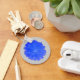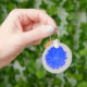 This pretty keychain features a photograph of a marigold flower that has been manipulated to make it a stunning bright blue colour. The flower sits on a grey background.