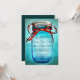 Blue Mason Jar Rustic Country Wedding Invitations with a blue tinted mason jar on a aqua blue distressed background. The mason jar has a burnt orange reddish bow tied around it. The back of the invitation is aqua blue with the word "Love" is white script in the centre. These are great for any country style wedding including rustic weddings, barn weddings, and any weddings using mason jars in the wedding reception decor.