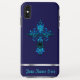 Gorgeous mediaeval cross in shades of blue and silver metallic trim with custom name, on denim blue background. Font colour, font style, and font size are customisable.