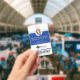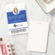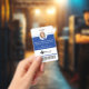 Professional and modern vertical circle photo blue identification badge. Customise with your photo, name, title, ID number, location name, logo and optional barcode. The design element can be changed to any colour to suit your brand, simply click personalise and click to customise further. The reverse side features location/address.
