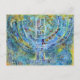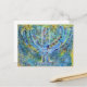 The original artwork for this menorah is a mixed-media painting created with acrylic paint, modelling paste, and paper by contemporary Jewish artist Meredith Gould.