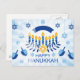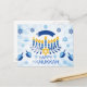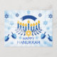 Blue menorah with golden flames, blue branches beneath and golden Star of David under centre candle. Red of background is made of of rays out from centre in pale blues, blue Stars of David as ornaments hanging from above and 4 dreidels. "Happy Hanukkah" at bottom.