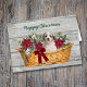 The front of this fun Holiday greeting card has a delightful image of a blue merle Australian Shepherd puppy dog in a wicker basket. The basket is decorated with poinsettia floral bouquets and a bright red bow. The customisable text above the image says "Happy Christmas" in green script. Everything is placed on a rustic grey wood panel background. The inside has two more text fields for you to customise as you like.