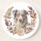 On this coaster, a beautiful portrait of a blue merle Australian Shepherd dog is placed at the centre of a pretty autumn wreath in tones of cinnamon brown, tan, and cream. Everything is placed on a white background.