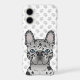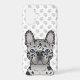 Destei's original cartoon illustration of a cute blue merle colour French Bulldog / Frenchie breed dog's head. The background has a pattern of grey dog paw prints.