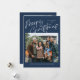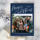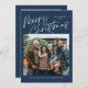 Blue Merry Christmas Calligraphy Script 4 Photo Holiday Card features modern calligrapy script on the front, along with one photo and three photos on the back.