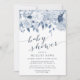 Elegant and modern floral baby shower invitation features a bouquet of soft pastel blue watercolor roses, peonies and hydrangeas with lush botanical leaves and eucalyptus. Personalise with your baby shower details in elegant smoky blue lettering accented with handwritten style calligraphy.