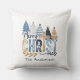 Christian Merry Christmas Throw Pillow with a typography design and modern blue Christmas trees, cross and custom family name. Easily personalise the name - Kate Eden Art