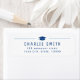 Modern typography design with graduation cap in blue and white, great personalised return address label for graduation party.