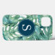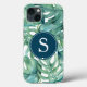 This monogram phone case features a watercolor tropical leaves in shades of green with your custom initial in white over a navy blue background. watercolor monstera palm leaf artwork and design by Victoria Grigaliunas. To see more beachy phone cases like this visit www.zazzle.com/dotellabelle