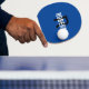 Modern ping pong paddle with a blue background, a black monogram and a white typography name. Personalise with your name and monogram.