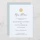 This simple, minimalistic, and modern wedding new plan announcement card features a monogram on a faux gold round with script letterings in dark grey on a pale blue background. The reverse side features a dusty blue background. You can find matching products at my store.