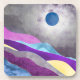 A beautiful abstract landscape design with a blue moon and colourful textured rolling hills in shades of purple, violet, blue, cyan, and yellow.