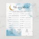 Cute over the moon theme baby shower "who is my mama?" game card featuring watercolor splash in blue with faux gold moon and stars. Match the baby animal name with their correct mothers! Whoever has the most names correct wins! ANSWER KEYS: 1.GOOSE=GOSLING, 2.DEER=FAWN, 3.SWAN=CYGNET, 4.ZEBRA=FOAL, 5.KOALA=JOEY, 6.SEAL=PUP, 7.PANDA=CUB, 8.WHALE=CALF, 9.PIGEON=SQUAB, 10.ALLIGATOR=HATCHLING, 11.GORILLA=INFANT, 12.CAT=KITTEN, 13.TURKEY=POULT, 14.GOAT=KID, 15.FISH=FRY, 16.LLAMA=CRIA