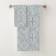 A towel set featuring a beautiful Moroccan tile inspired pattern in light blue and cream. Makes a beautiful addition to your bathroom or gift idea for someone who likes Moroccan tile inspired designs.