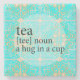 Tea - noun - a hug in a cup. Thus reads the whimsical definition typeset on this lovely, Moroccan-style turquoise tea-time tile coaster.