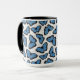 Seamless pattern design with blue morpho butterflies on hydrangea flowers linework background.