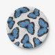 Seamless pattern design with blue morpho butterflies on hydrangea flowers linework background.