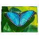 Butterfly Blue Morpho against a background of green foliage and yellow light.