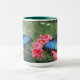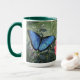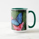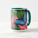Decorative mug in blue, pink and green colours. Beautiful Butterflies Blue Morpho against the background of blooming roses near the water.