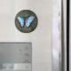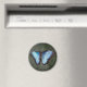 Blue Morpho butterfly resting on a leaf photographic magnet. Available in square and round sizes