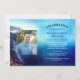 Life celebration invitation in shades of blue with a watercolor wash meeting a photo of a craggy beach and your loved one's photo. Ocean themed funeral invitation personalised with a photo. Blue watercolor memorial invitation with a photo and blue and white text.