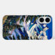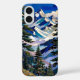 Bold and artistic iPhone case featuring a stunning mountain landscape in rich blue tones, with layered peaks, forest details, and soft clouds. The vibrant composition creates a striking and nature-inspired look.