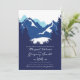 Blue mountains and conifer trees wedding invitation. An elegant wedding invite showcasing a mountain range through conifers and your names in handwritten style. The back includes white polka dot pattern on navy blue.