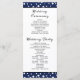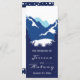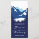 Blue mountains and conifer trees ceremony and party wedding program . An elegant wedding design featuring a mountain range through conifers and your names in handwritten style. The back includes blue and white borders with white polka dots on top and at the bottom of the card.