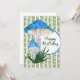 Pretty watercolor illustration of blue mushrooms on green and white aspen trees background with customisable Happy Birthday text.