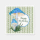 Pretty watercolor illustration of blue mushrooms on green and white aspen trees background with customisable Happy Birthday text.