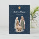Beautiful blue Christian Christmas card featuring a scene with Mary, Joseph and the infant Jesus Christ in the manger in Bethlehem on the front and a watercolor painting of poinsettia, holly and red berries at the back.