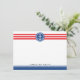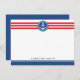 Personalised flat note card featuring a white anchor inside a blue emblem with white border. At the top are three red stripes and at the bottom a dark blue border. Customisable name.