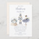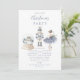 A graceful pastel Christmas invitation featuring a blue nutcracker, elegant ballerina, and snow globe manor illustration. The watercolor design blends soft winter hues with refined holiday charm, perfect for festive soirées, Christmas teas, or seasonal gatherings in a classic yet whimsical style.