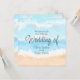 Beautiful watercolor art with blue and teal ocean waves on a sandy beach coastal themed wedding invitations.
