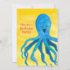A fun invitation to gather the kids for a birthday party decorated with a happy blue octopus illustrated with several shades of watercolor on a bright yellow watercolor wash background.