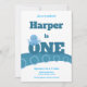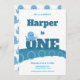 A birthday party invitation with a blue octopus theme. It is set up for a first birthday. The age can be changed and, if you use capital letters for the age, the little octopus can easily sit on top of the age.
