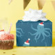 Wrapping Paper with a novelty Christmas pattern of smiling, blue, octopus illustrations wearing Santa hats on a blue background.