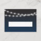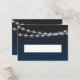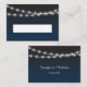 An elegant modern Wedding Reception guest place name business cards in a navy blue watercolor ombre effect with faint brush strokes. To the top of the cards, on both front and back, are two strings of sparkling string tea-lights with the background serving as a night sky. The Bride and Groom's names and Wedding Date can be added to the reverse of the card.