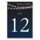 An elegant modern Wedding Reception Table Number card in a navy blue watercolor ombre effect with subtle brush strokes. To the top of this co-ordinating card are two strings of sparkling string lights with the background serving as a faux night sky. Text entered into the template fields is automatically added to both the front and reverse of the card.